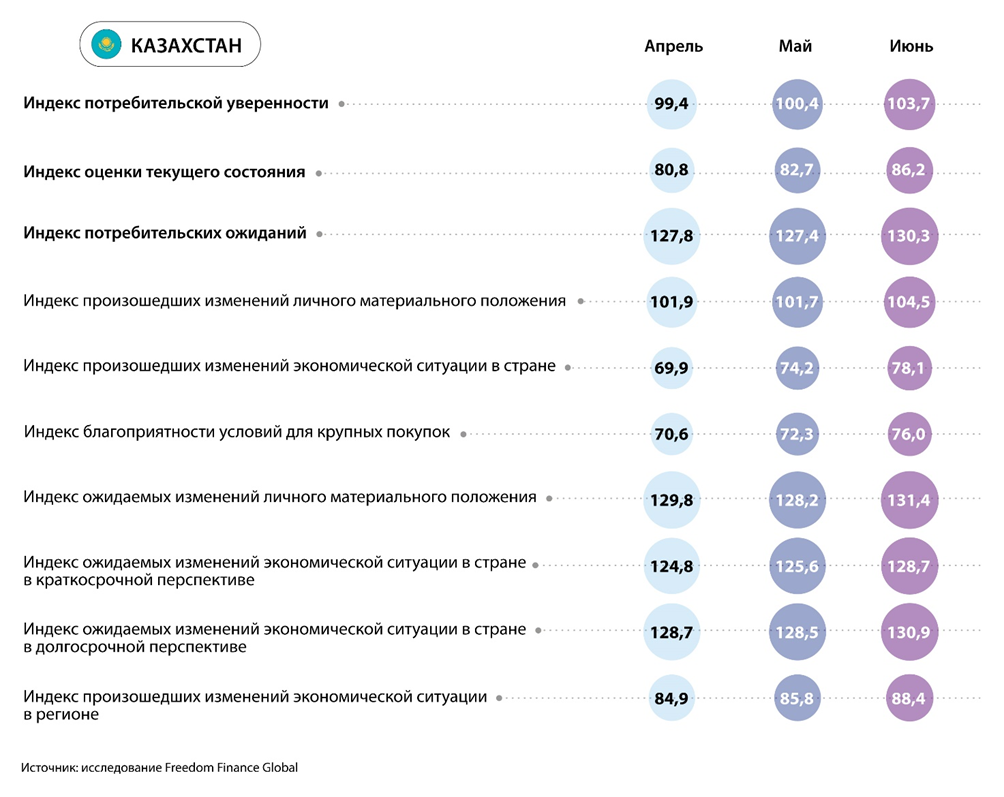 Индекс потребительской уверенности (CCI) в Казахстане в июне показал улучшение третий месяц подряд и достиг 103,7 пункта, что указывает на более уверенное нахождение в позитивной зоне выше 100 пунктов. Улучшение настроений случилось практически равномерно по всем пяти субиндексам. При этом можно выделить оценки экономического состояния и благоприятности условий для крупных покупок. Также отметим, что в сравнении с прошлогодним июнем CCI оказался на 6,8 пункта выше.