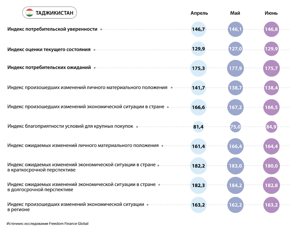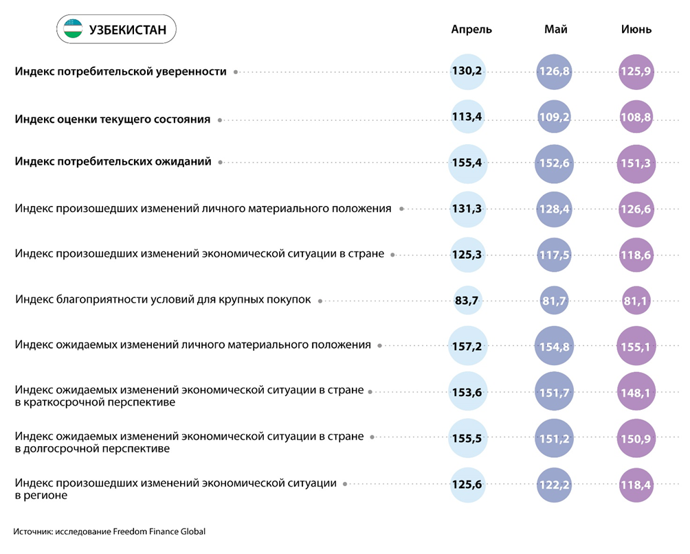 У лидера по индексу потребительской уверенности Таджикистана ситуация остается стабильной. Индекс находится примерно на прежних уровнях четвертый месяц подряд. Отмечаем резкое восстановление оценок благоприятности условий для крупных покупок. Ну а единственной страной, показавшей рост пессимизма в сравнении с маем, оказался Узбекистан, где CCI обновил антирекорд и падает третий месяц подряд. Тем не менее снижение оказалось небольшим, а по двум вопросам из пяти респонденты показали рост позитива. Однако особенно заметно ухудшились прогнозы узбекистанцев по экономической ситуации в горизонте следующих 12 месяцев.
