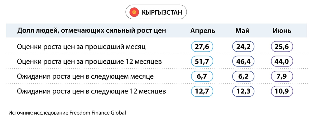 Инфляционные оценки и ожидания кыргызстанцев в июне показали разнонаправленное движение, хотя по части вопросов в горизонте 12 месяцев были достигнуты новые рекорды. Если в мае 24,2% опрошенных ощущали очень сильный рост цен за прошедший месяц, то в июне таких набралось 25,6%. Но, с другой стороны, оценки роста цен за прошедшие 12 месяцев снизились до рекорда. В июне 44% кыргызстанцев фиксируют ускорение роста цен, тогда как в мае этот показатель составлял 46,4%. Официальные данные по годовой инфляции указывают на продолжение снижения в июне с 4,6 до 4,5%, что является рекордом с февраля 2020 года.