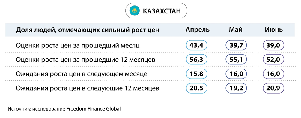 Среди отдельных товаров и услуг большинство респондентов все еще волнует существенный рост цен на продукты питания. Список наиболее заметно подорожавших категорий товаров остается неизменным: «Мясо и птица», «Молоко и молочные изделия», «Хлеб и хлебобулочные изделия» и «Овощи и фрукты». Тем не менее по хлебу в этот раз куда меньше людей заметили сильный рост цен: 24,6% против 31,9% – в мае. И все же отметим, что эти продукты питания продолжают находиться в топ-4 у опрошенных казахстанцев последние восемь месяцев подряд. В целом особо заметного увеличения инфляционных ощущений по отдельным продуктам не появилось, кроме как по интернету и связи. По этому виду услуг доля заметивших сильный рост цен увеличилась с 4,7 до 12,1%. Отметим небольшое снижение и стабилизацию аналогичного показателя по услугам ЖКХ в районе 15–16%. Согласно официальной статистике, средний месячный рост тарифов на услуги ЖКХ составил лишь 0,2%, что значительно ниже, чем в предыдущие два месяца (0,9 и 0,7%).