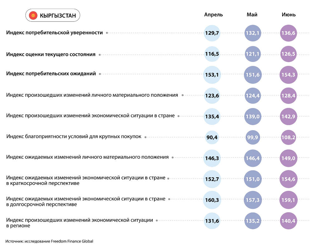 В Кыргызстане индекс потребительской уверенности в июне показал рост четвертый месяц подряд. При этом темп роста ускорился и достиг 4,5 пункта и составил рекордные за все время исследования 136,6 пункта. Все пять субиндексов, определяющих композитный уровень CCI, увеличились относительно мая. Вновь наибольший рост наблюдается в вопросе благоприятности текущих условий для крупных покупок, субиндекс которого существенно превысил нейтральную границу в 100 пунктов.