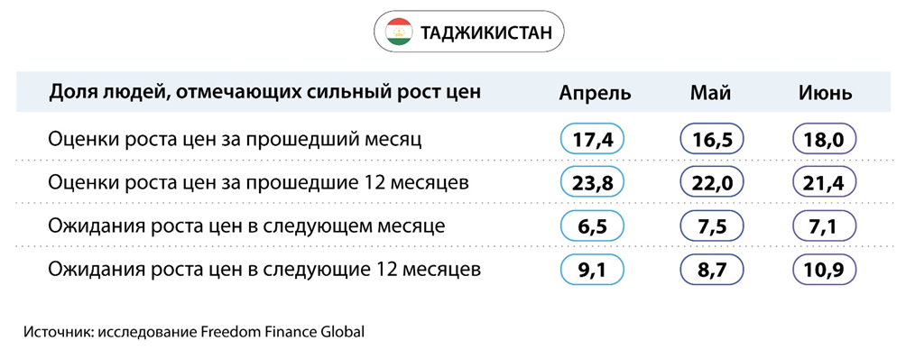 Инфляционные оценки и ожидания таджикистанцев в июне немного увеличились после рекордно низких результатов в апреле и мае. Доля респондентов, отметивших сильный рост цен за последний месяц, увеличилась с 16,5 до 18%. В горизонте последних 12 месяцев доля тех, кто ощутил более быстрый рост цен, упала с 22 до 21,4%. Инфляционные ожидания жителей Таджикистана также показали схожую динамику в разных временных рамках. 7,1% жителей ждут очень сильного роста цен в ближайший месяц, тогда как в мае таких было 7,5%. Но в горизонте следующих 12 месяцев доля людей, ожидающих более быстрого роста цен, выросла с 8,7 до 10,9%.