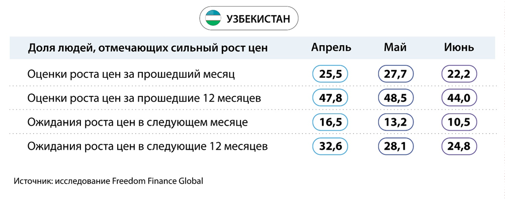 Инфляционные ожидания жителей Узбекистана продолжили снижение второй месяц подряд. Также заметно упали инфляционные оценки, которые приблизились к мартовским уровням до отмены нулевой ставки НДС. Так, за прошедший год очень сильный рост цен ощутили 44% жителей против 48,5% – в мае. А в горизонте прошедшего месяца доля ощутивших сильный рост цен также упала с 27,7 до 22,2%. Инфляционные ожидания также значительно снизились по обеим временным рамкам и обновили новые абсолютные минимумы за все время исследования. Доля ожидающих сильного роста цен в следующем месяце снизилась с 13,2 до 10,5%. А в горизонте одного года 24,8% респондентов ожидают более быстрого роста цен, хотя в мае таких было 28,1%.
