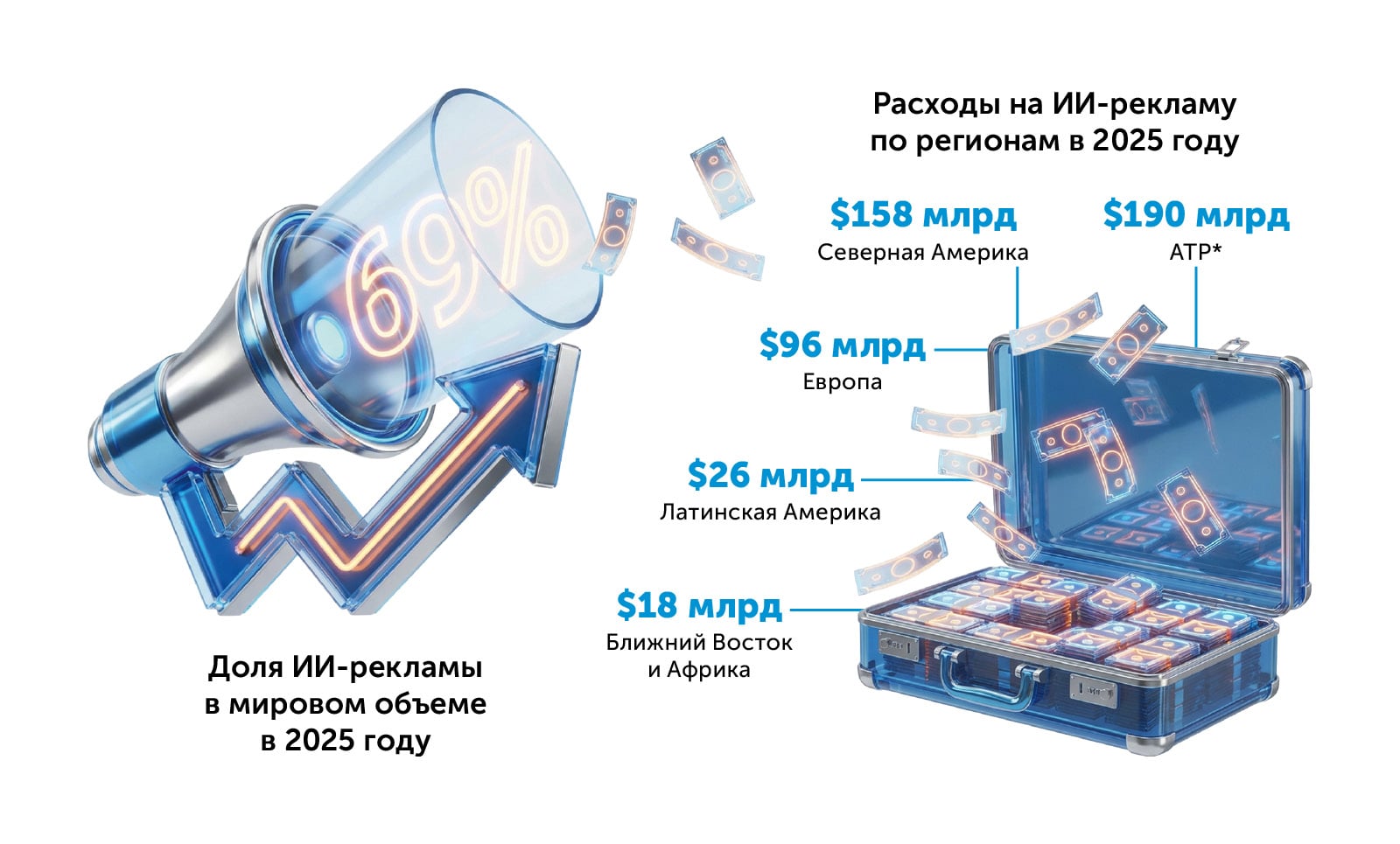 Массовое внедрение ИИ-инструментов в рекламные сервисы позволило ведущим интернет-компаниям повышать возврат вложений в рекламу (ROAS – метрика, которая демонстрирует отношение дохода от рекламы к затратам на нее) при меньших «ручных» настройках. Это стимулировало рекламодателей перенаправлять средства на продвижение именно через эти платформы. Итог – резкий рост доходов интернет-гигантов. Выручка Alphabet в III квартале 2025 года увеличилась почти на 16% год к году, до $102,3 млрд, аналогичный показатель Meta поднялся на 26%, до $51,24 млрд, 98% из этой суммы пришлось на рекламу.