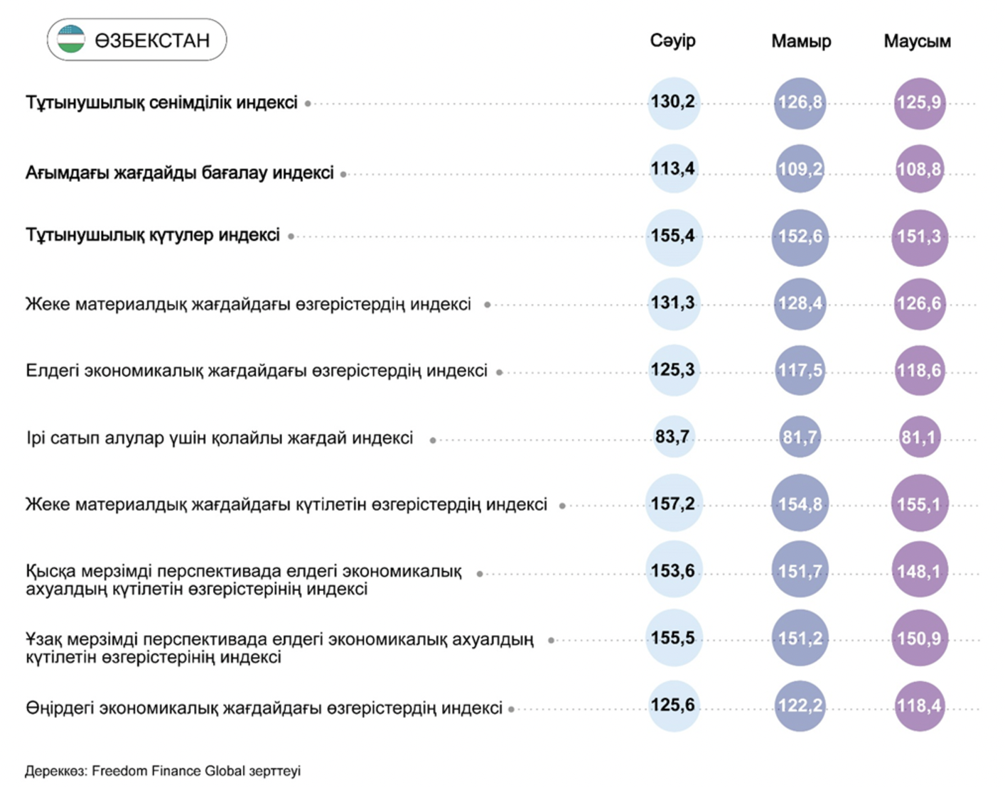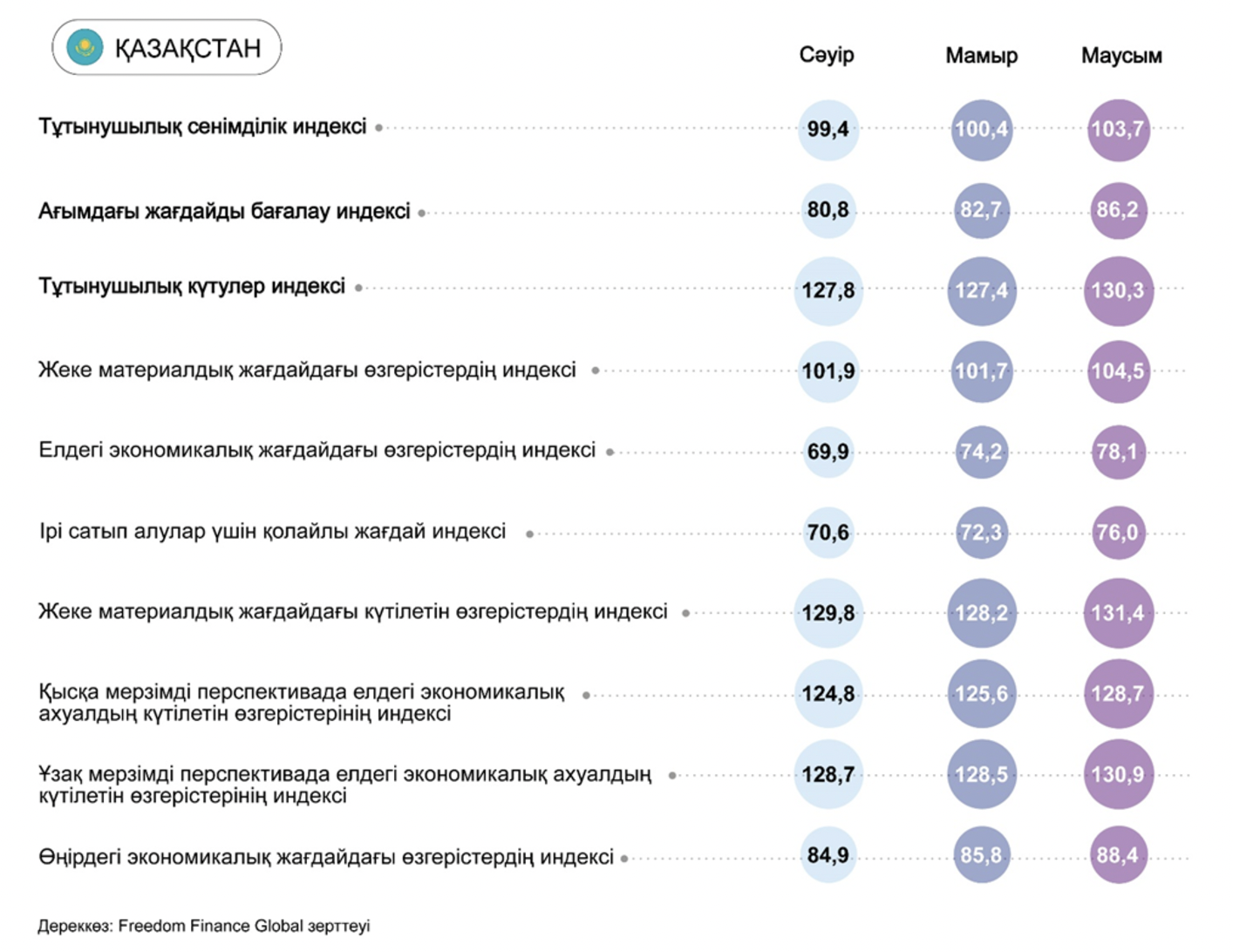 Маусым айында Қазақстандағы тұтынушылық сенімділік индексі (CCI) үшінші ай қатарынан жақсарғанын көрсетті және 103,7 тармаққа жетті, бұл 100 тармақтан жоғары оң аймақта сенімдірек болғанын көрсетеді. Көңіл-күйдің жақсаруы барлық бес қосалқы индекс бойынша біркелкі болды. Бұл ретте экономикалық жағдайды және ірі сауда жасауға жағдайлардың қолайлылығын бағалауды атап өтуге болады. Сондай-ақ, өткен жылғы маусым айымен салыстырғанда CCI индексі 6,8 тармаққа жоғары болып шыққанын атап өткен жөн.