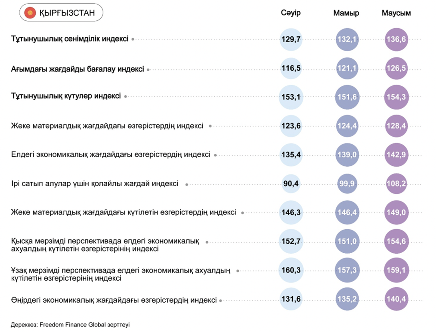 Қырғызстанда маусым айында тұтынушылық сенімділік индексі төртінші ай қатарынан өсім көрсетті. Бұл ретте өсу қарқыны жылдамдатылып, 4,5 тармаққа жетті, ал CCI индексі зерттеудің барлық уақытында рекордтық 136,6 тармақты құрады. CCI индексінің композиттік деңгейін анықтайтын барлық бес қосалқы индекс мамырға қарағанда ұлғайды. Ірі сауда жасау үшін ағымдағы жағдайлардың қолайлылығы мәселесінде тағы да ең көп өсу байқалуда, оның қосалқы индексі 100 тармақты құрайтын бейтарап шекарадан айтарлықтай асып түсті.