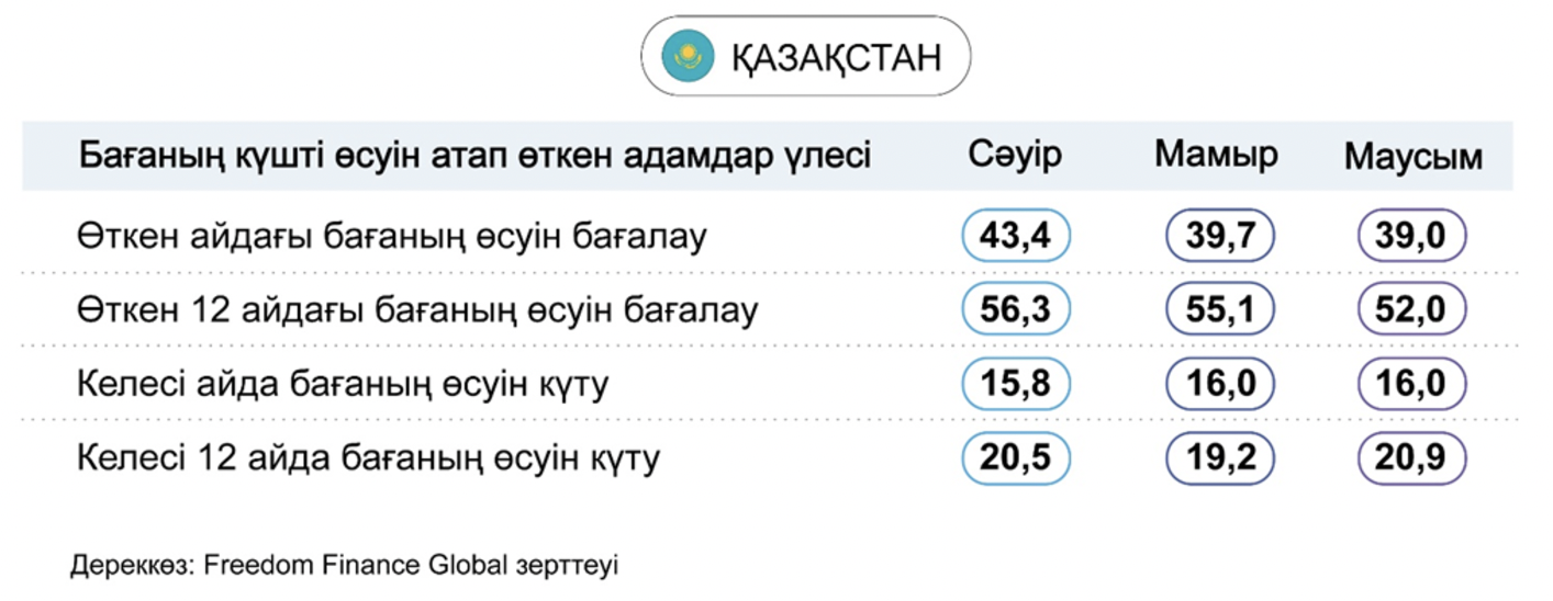 Қазақстан Республикасы Ұлттық банкінің инфляциялық бағалау және күтулер бойынша осындай зерттеуі тағы да ұқсас серпінді көрсетті. Оның деректеріне сәйкес бағалардың қатты өсуін күтетіндердің үлесі бір жыл ішінде 24,9%-дан 26,4%-ға дейін өсті. Сондай-ақ, бір айдың деңгейінде осындай көрсеткіш 17,7%-дан 18,5%-ға дейін өсті. Ал инфляциялық бағалау бір айдың, сондай-ақ 12 айдың деңгейінде де көп айлық ең төмен деңгейлерді жаңартты.