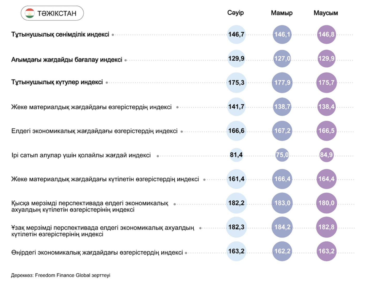 Тәжікстандағы тұтынушылық сенімділік индексі маусым айында 146,1 тармақтан 146,8 тармаққа дейін өсті. Жалпы алғанда соңғы төрт айда индекс шамамен бір деңгейде қалып отыр. Дегенмен, жекелеген қосалқы индекстер мамырға қатысты әртүрлі бағыттағы қозғалысты көрсетеді. Ірі сауда жасау үшін ағымдағы жағдайлардың қолайлылығын бағалау бәрінен күшті өсіп, олар өткен үш айдың шығындарынан толығымен қалпына келді. Екінші жағынан, қалған төрт қосалқы индекс төмендегенін көрсетті, олардың ішінен ең көбі алдағы 12 айдың деңгейіндегі экономикалық жағдай бойынша тұрғындардың болжамдары ерекшеленуде.