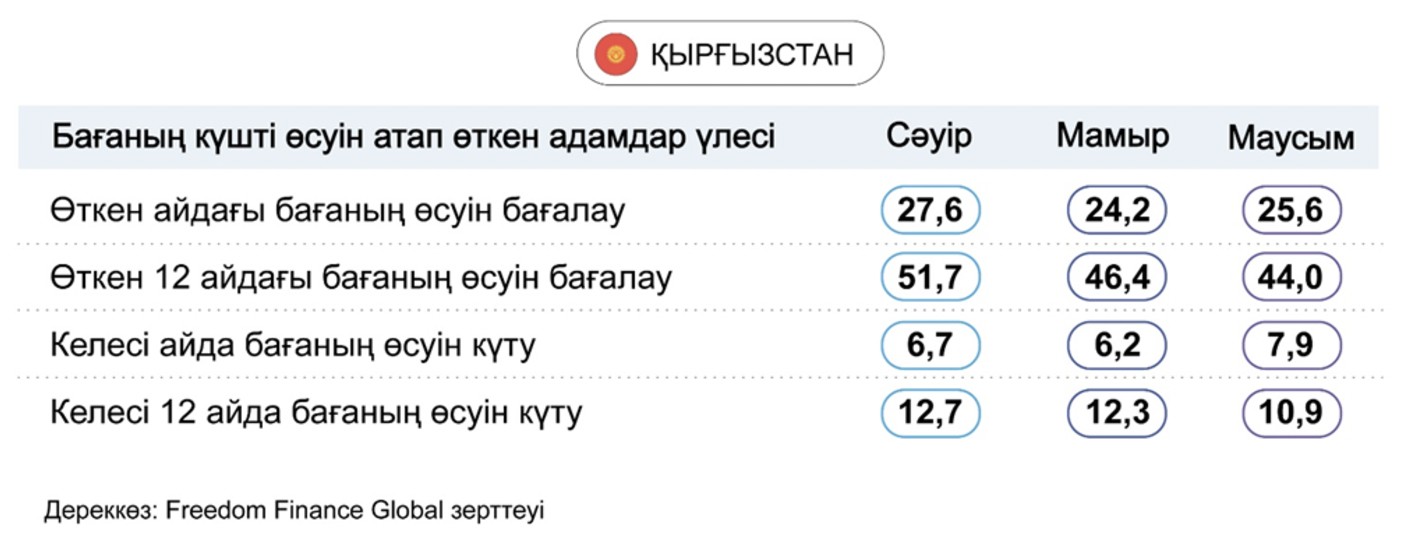 Қырғызстандықтардың инфляциялық болжамдары да уақытша деңгейге байланысты әртүрлі бағыттағы қозғалысты көрсетті. Келесі 12 айда бағалардың ең жылдам өсуін күтетін респонденттердің үлесі 12,3%-дан 10,9%-ға дейін төмендеді. Алайда, баға келесі айда қатты өседі деп санайтындардың үлесі 6,2%-дан 7,9%-ға дейін өсті.