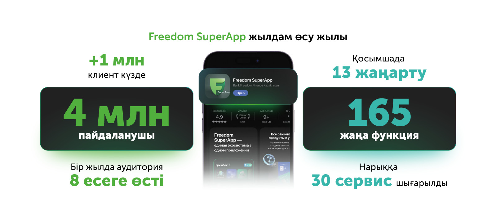 • Қазақстандық Freedom SuperApp қосымшасы 2024 жылдың басында пайда болды. Ол банк сервистерін, брокер қызметтерін, сақтандыруды және жеке телеком-инфрақұрылымды біріктіреді. Клиент мұнда шот ашып, несие рәсімдей алады, инвестициялай алады, қызмет ақысын төлей алады, тіпті интернетке де қосыла алады. Барлығы онлайн жұмыс істейді және мемлекеттік дерекқорлармен біріктірілген. Автоматтандырудың арқасында ипотеканы мақұлдау бір тәулік, ал автокредитті ресімдеу - 12 сағаттан аспайды. 2025 жылғы қазанға қарай SuperApp-тің бірегей ай сайынғы пайдаланушыларының (MAU) саны 1,6 млн-ға жақындады, ал оның аудиториясы екі мәнді қарқынмен өсуде.