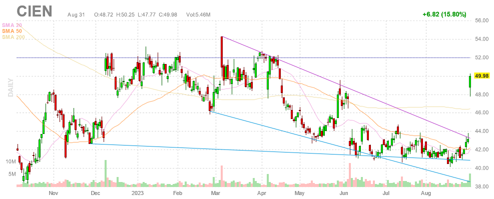 На торгах 31 августа акция CIEN стоила $49,98. Рыночная капитализация составила $7,4 млрд.