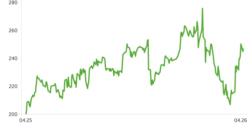 Техническая картина. Акции SIE в начале апреля вышли из нисходящего канала и развивают локальный восходящий тренд. В случае пробоя сопротивления на уровне 250 евро возможен рост котировки к 275 евро.
